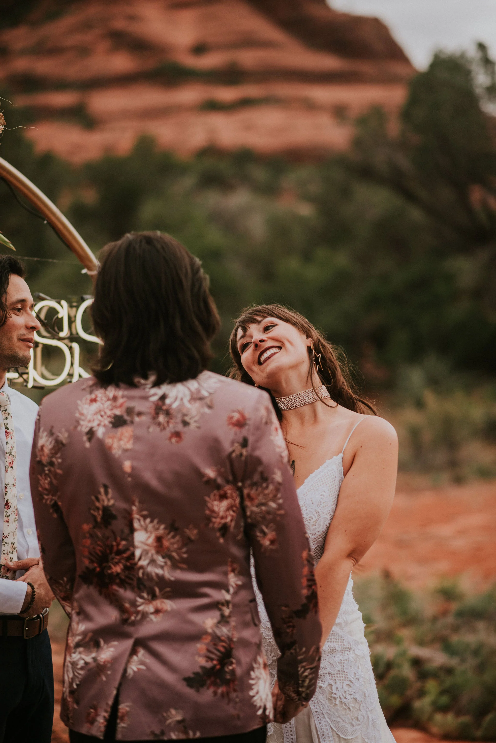 Bride & Groom Laugh during Epic Sedona Wedding Ceremony Photographed by Santa Barbara Wedding Photographers Tessa Tadlock